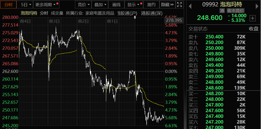 受大量补货、二手成交价下滑消息影响,6月19日,泡泡玛特股价下跌5.33%,最新市值为3338.56亿港元,较最高点时期跌去超240亿港元。